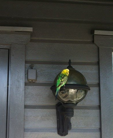 Den var på terrassen og da jeg prøvde å få tak i den fløy den inn i huset. Har ikke bur og har ikke noe kunnskap om fugler. Nå sitter den 5 m oppe i taket på en ledning.