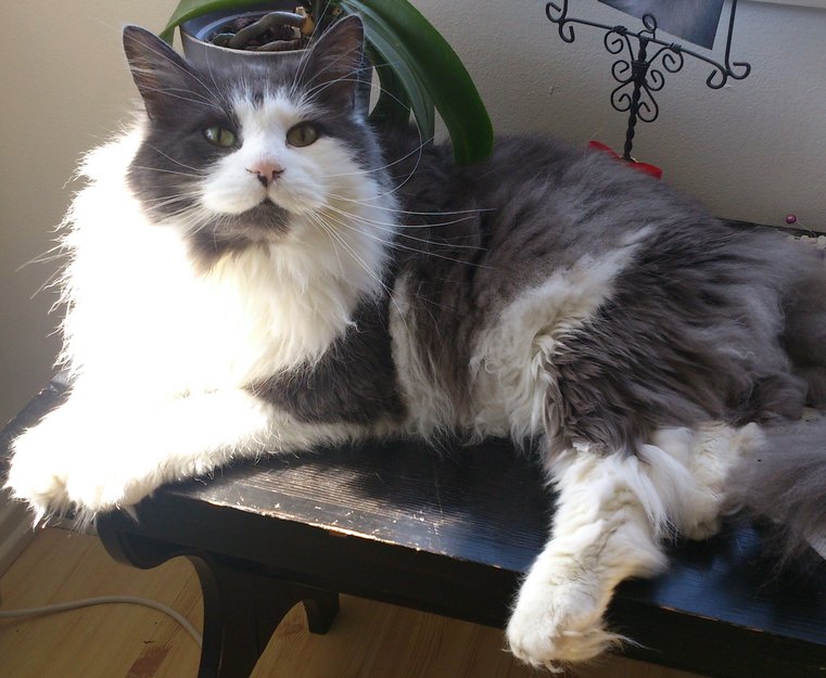 50/50 grå og hvit i ansiktet. Små, hvite hår på ørene. Hvite labber, grå på ryggen og hvite krøller på magen. Kraftig katt med ganske store poter. Svært varsom for ørene sine. Rosa nese med en liten svart flekk nederst til venstre når man ser på han.