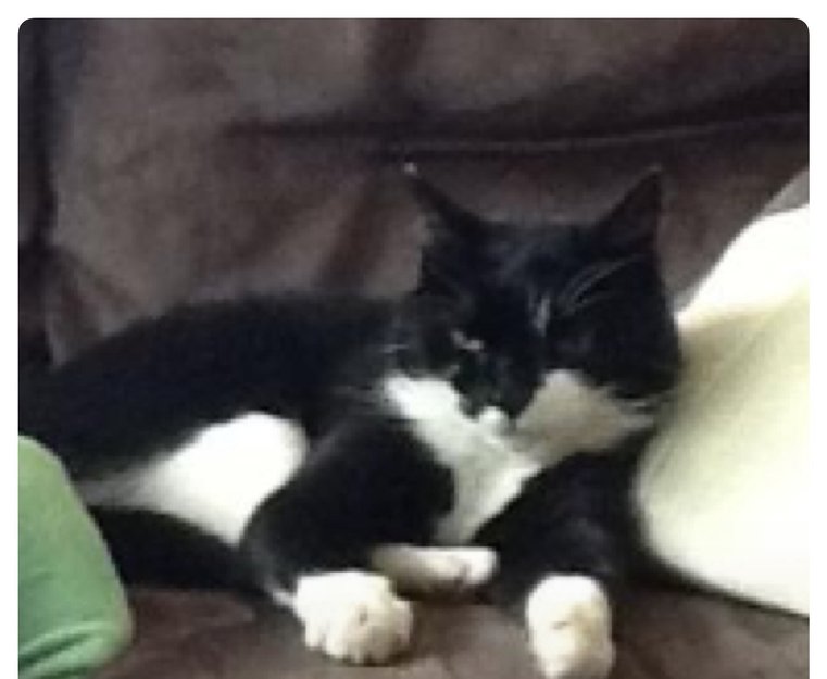 Liten katt (3,5kg), svart med hvit fra munn og ned under brystet. Med hvite poter.