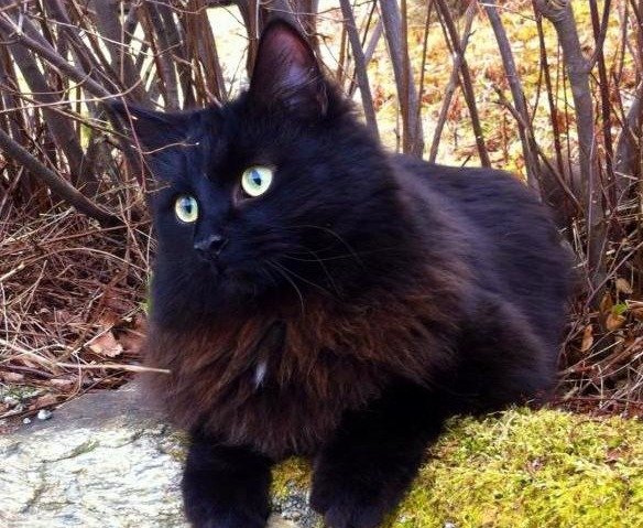 Linus er svart med litt brunskjær. Han har en liten "flekk" med hvitt på halsen.