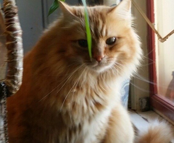 En langhåret katt med orange og hvit pels. Er hvit ytterst på halen. Blå øyne. Har litt korte ben i forhold til kroppen, men er ganske stor av vekst. Er nylig omplassert fra nesodden. Kan hende at den sitter fast i et tre.