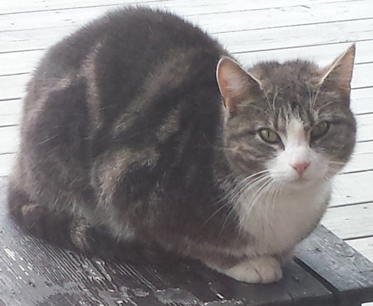 Katten har slått seg ned på vår veranda og den mjauer mye. Har sett den sporadisk i løpet av vinteren og trodde den hørte til et sted i nærheten. Nå er den hos oss hver dag.