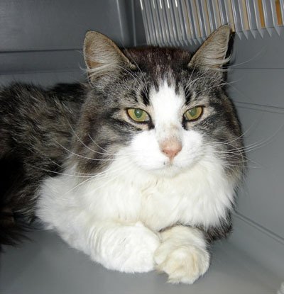 Snill og tillitfull hannkatt. Han er kastrert og savner hjemmet sitt. Han har langhåret pels, gråspraglete over, hvit under og i ansiktet.