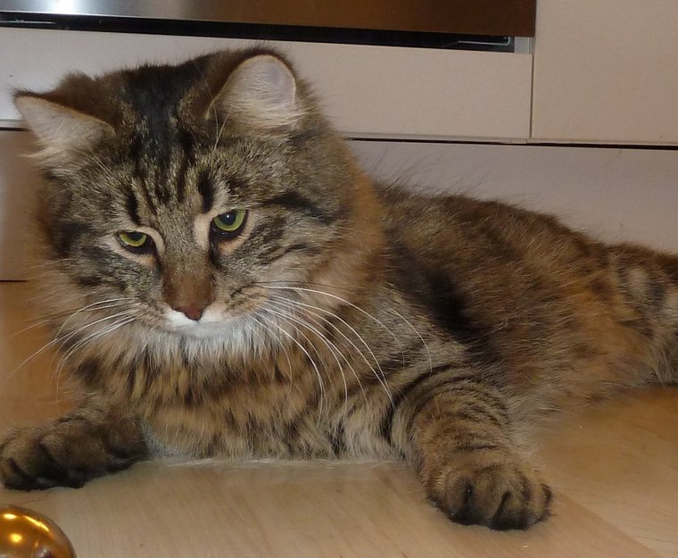 Vår kjære, snille Fernando er en ung hannkatt på ett år. Han ligner en tigerstripete/spottet skogkatt og har lang og tykk, buskete hale. Han har svarte tredeputer. Han er hvit nedenfor nesen og under haka. Nesen er rødbrun.