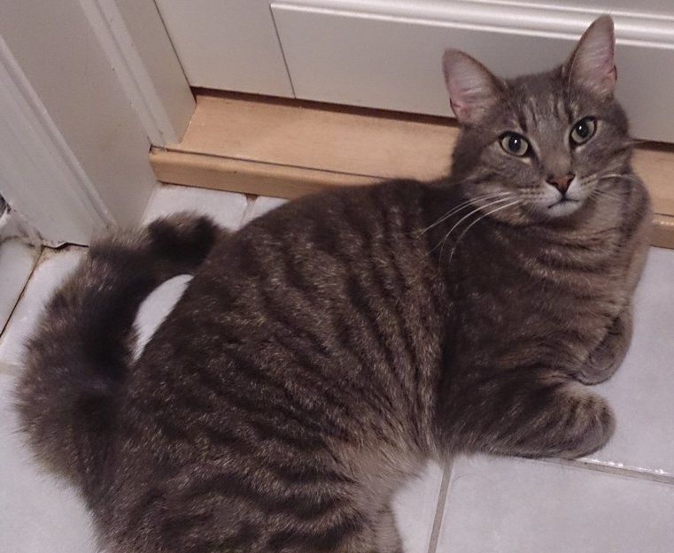 Grå tigerstripet. Vakker katt med store øyne. Han ser litt spesiell ut med halen som han bærer i en krøll oppå ryggen, omtrent som en elghund. Pratsom. Veldig takknemlig for all informasjon om noen ser han. Han er dypt savnet.
