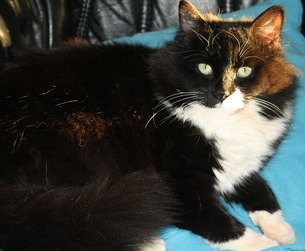 Lucy er ei langhåret kastrert jentepus. Hun er svart, med hvitt på brystet, labbene og halve leppa.