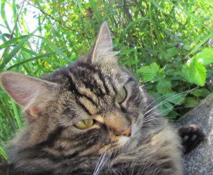 Funnet i busker over veien. Svarte på navn med høye mjau. Det hjelper å rope.