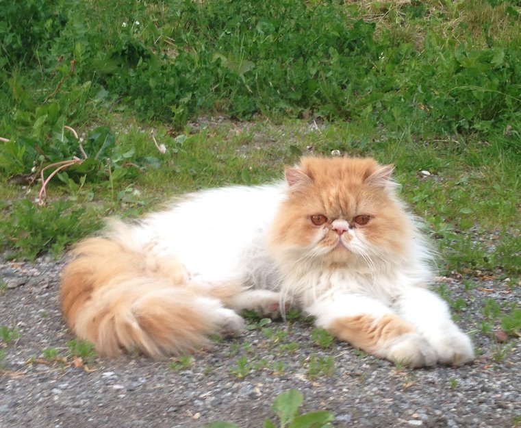 Oransj og hvit perser prøver å flytte inn hos oss. Ganske tynn og pjuskete, kan ikke finne noen merking. Veldig kontaktsøkende