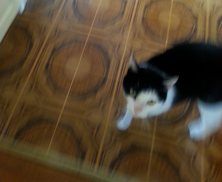 Svart og hvit tegnet hannkatt, ikke voksen. Katten har begynt å komme hjem til meg. Den er kjælen og snill, og virker veldig sulten. Kanskje den bor rundt her og er nyinnflyttet, men den virker litt forvirret. Jeg skal sjekke om den har chip. Den kommer hver dag nesten til samme tid. Solberg og Dikemarkområdet.