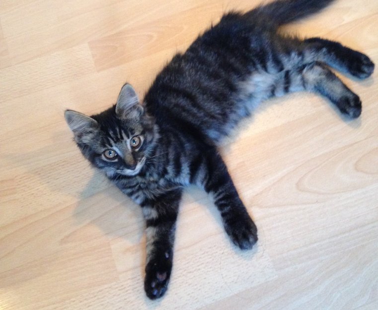 Veldig ung, energisk og leken katt. Eventyrlysten (måtte slites ut med lek) – sover nå søtt på gulvet akkurat der den ligger på bildet (5 minutter etter).