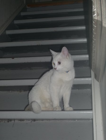 Helt hvit i pelsen, har en rosa nese med en svart flekk som går over ca halve nesen og grønne øyne. Blått halsbånd med stjerner. Han er veldig glad i mennesker og er ikke redd for å smette inn til de fleste.