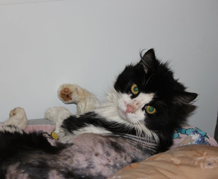 Se bilde. Katten er barbert pga tovet pels.