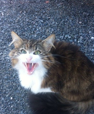 Denne katten har hengt rundt huset vårt fra og til det siste halve året. Han har dukket opp av og til, men nå har han hengt rundt her den siste uken mer eller mindre fast. Han prater mye, nærmest hyler, og er veldig kosete men litt skvetten. I dag virket pelsen mer flokete og vi så noen store flått på han, synes også å merke at han har blitt tynnere så hadde ikke hjertet til å ikke gi han litt mat i dag, han nærmest slukte det! Håper det finnes en eier der ute som ønsker å få denne fine katten hjem igjen!