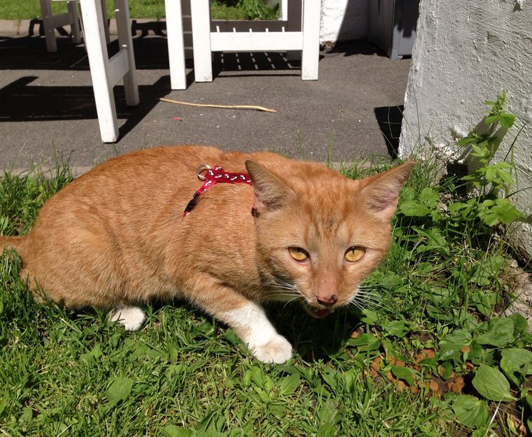 Sulten, veldig kosete rød og hvit har dukket opp i bakgården vår i hertug skules gate, Tøyen. Har rød sele.