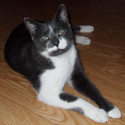 Han er litt sky. En stor hankatt med fin grå pels, hvit under. har en liten knekk på halespissen. Han har en hvit skrå stripe i ansiktet.
