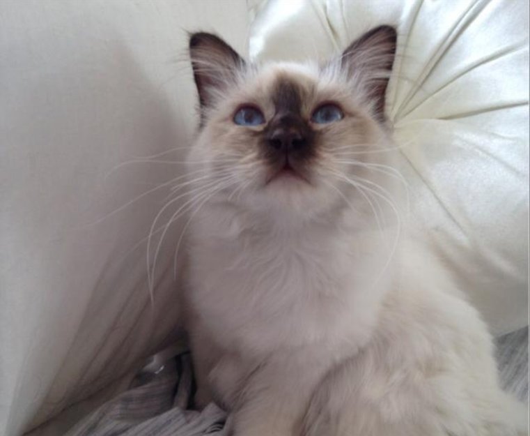 Hun er en sjokolademasket Hellig Birma på snart 1år. Hun er egentlig en innekatt men har fått lov til å være litt ute nå på sommeren, hun er ikke vant til biler og utestøy..
