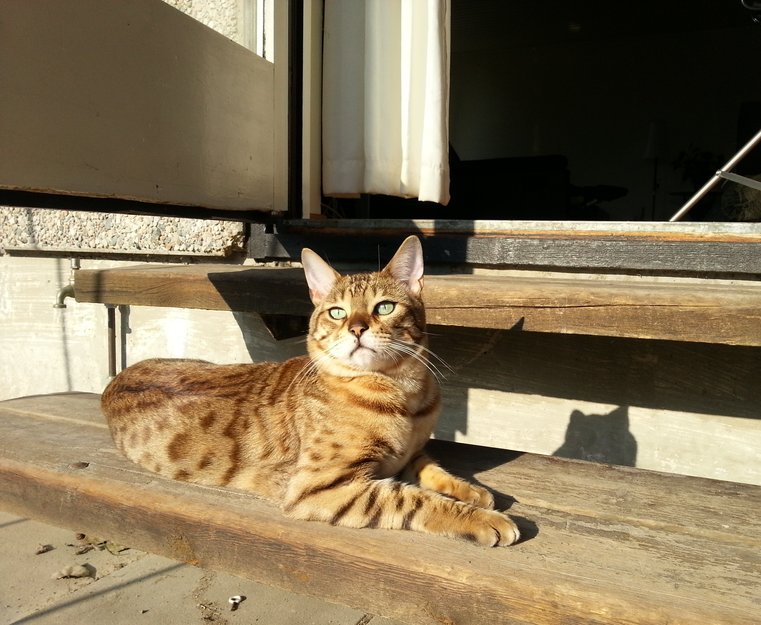 Han er en lang, slank katt med tiger/leopardmønstret, kort pels. Haletippen er sort og ørene er store og spisse. Han "snakker" veldig mye, og er veldig kjælen. Han høres ut som om han er på vei til å dø hvert øyeblikk, men dette er bare kommunikasjon.