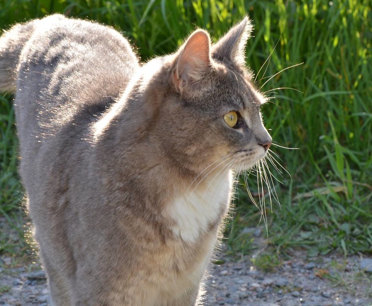 Lys gråstripet med litt hvitt på brystet og bakbeina.