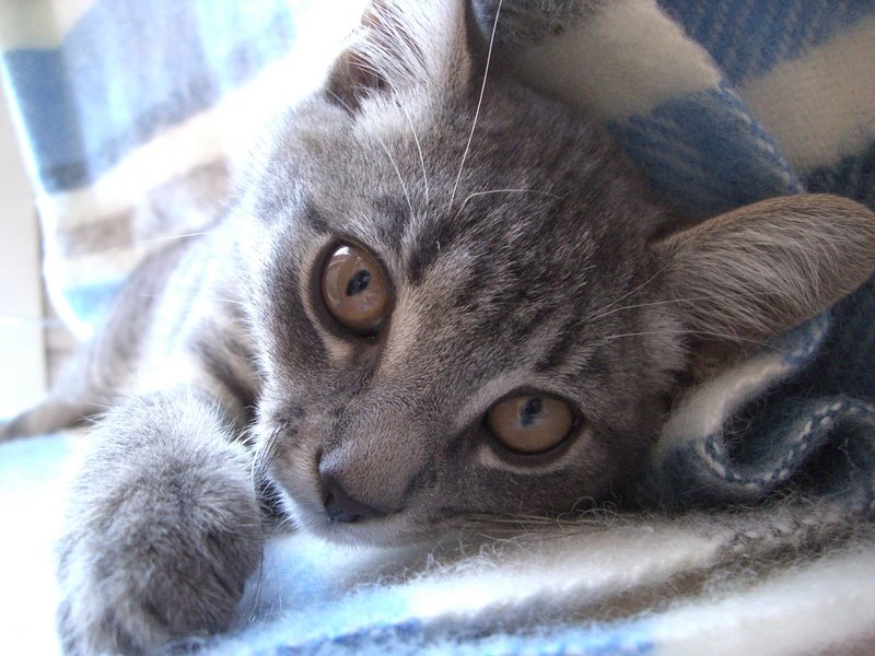 Gråstripet, korthåret, spretten og glad. Tillitsfull og kjælen.