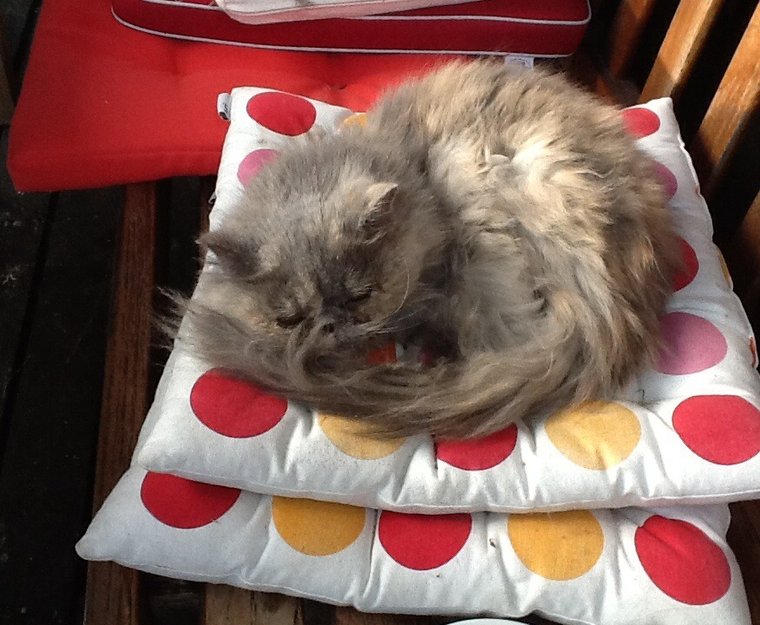 Lå på pute på terrassen i dag tidlig. Kanskje syk, men maler når den blir klappet. Lysebrun perser.