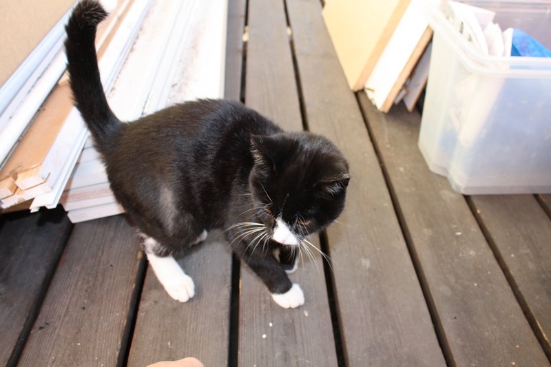 Kattungen dukket opp på vår veranda i går og har vært her siden. Den er veldig kosete og tillitsfull.