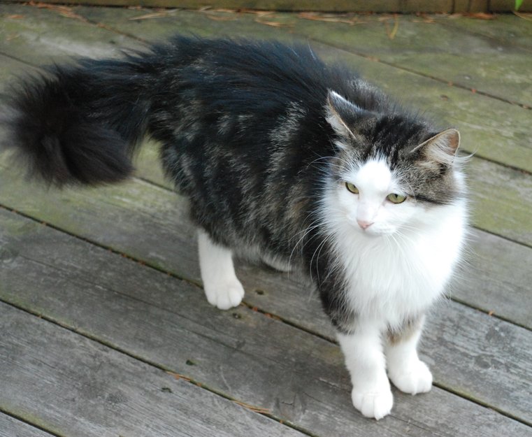 Alle bena hennes er hvite og hun har litt "grønne" øyner. Hun er også hvit fremme på brystet. Hun er ikke så veldig kraftig og er ellers veldig kjælen men har også litt "jakt" instinkter.
