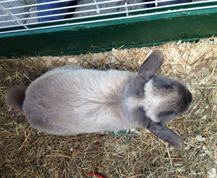 En nabo borti gaten er på ferie og hadde satt en hundegarde rundt kaninburet. Kaninen har flyttet garden til en klarte å grave hull i fugen mellom to skifer heller og kommet seg ut.