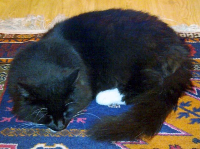 Ganske stor, langhåret, kastrert hankatt med svart pels og hvite poter på alle beina. Har også litt hvitt i brystet og på magen. Han er dessverre ikke id-merket. Er litt redd ukjente mennesker, men glad i mat og kos når han er trygg.