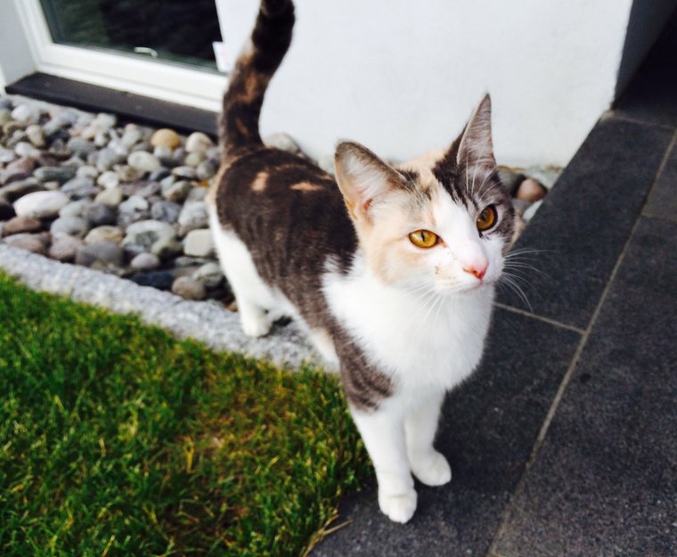 Katten hadde tydeligvis vært hjemløs en stund, men en familie I området hadde "adoptert" den for ikke så lenge siden. Den ble borte fra dem samme dag som den dukket opp i hagen vår, og de så annonsen vår på dyrebar.no og tok kontakt.