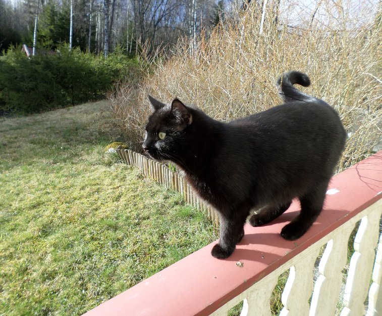 Hun er ensfarget, korthåret, med noen få hvite hår på brystet. Er chippet uten øremerking. Litt sky overfor fremmede. Er oppvokst med både hunder og andre katter. Ca 2 år