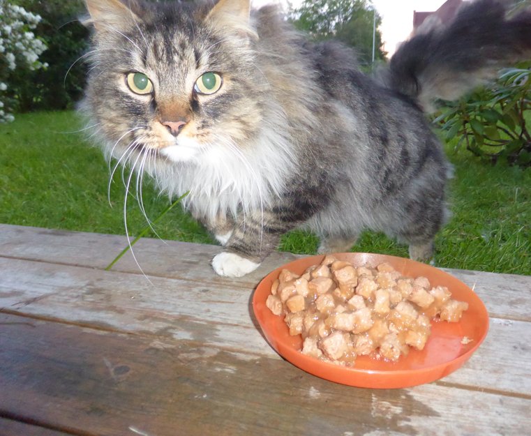 Katten kommer her nesten hver senkveld og er meget sky. Litt usikker om den begynte å komme i mai eller begynnelsen av juni. Uansett har den nå etter hvert blitt mer og mer kosete/oppsøkende. Søker mat og trygghet virker det som. Den lager av og til koselyder når vi spør om det vil ha mat. Veldig søt katt som nok søker et trygt hjem/leter etter sitt gamle hjem. Halen er pjuskete og katten har hatt/har store toveproblemer over baken. En periode var halve bakdelen dekket med tover. Det så nesten ut som den hadde "korsett". Det verste her har heldigvis sluppet her. Oppsummert: En kjempesøt, oppsøkende og kosete langhåret katt i sitt rette element, men samtidig meget skeptisk(kanskje iom vi ikke kjenner den).