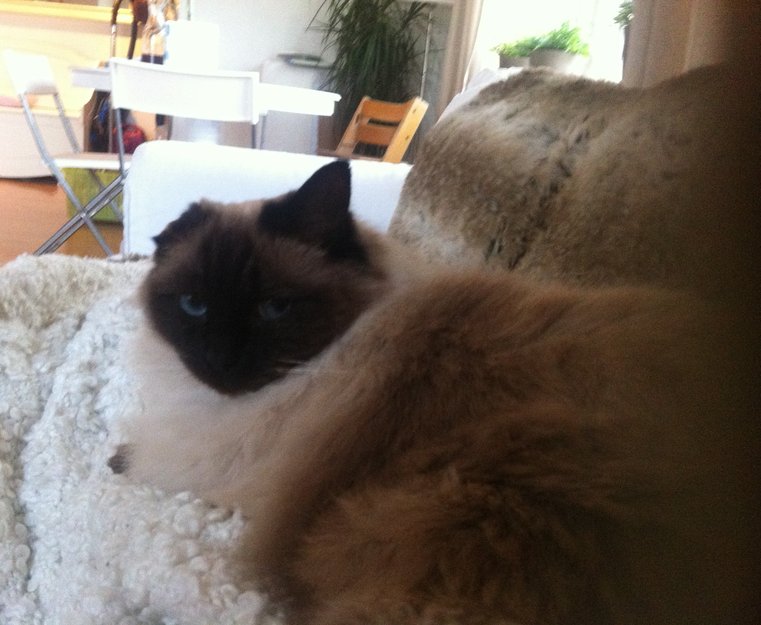 Chanti har spist masse håndreskede reker (eneste hun spiser uten sitt faste tøttfor) og hviler på plassen sin i sofan, tett ved siden av "matmor"