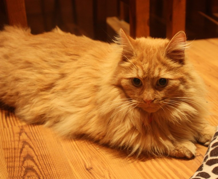 føflekk på nesen, helt oransje, mørkere bak på bakbeina, lite kutt i øyret, hvit i øyenkrokene. To halsbånd, et grått/svart med telefonnr mitt på og et mot flått.