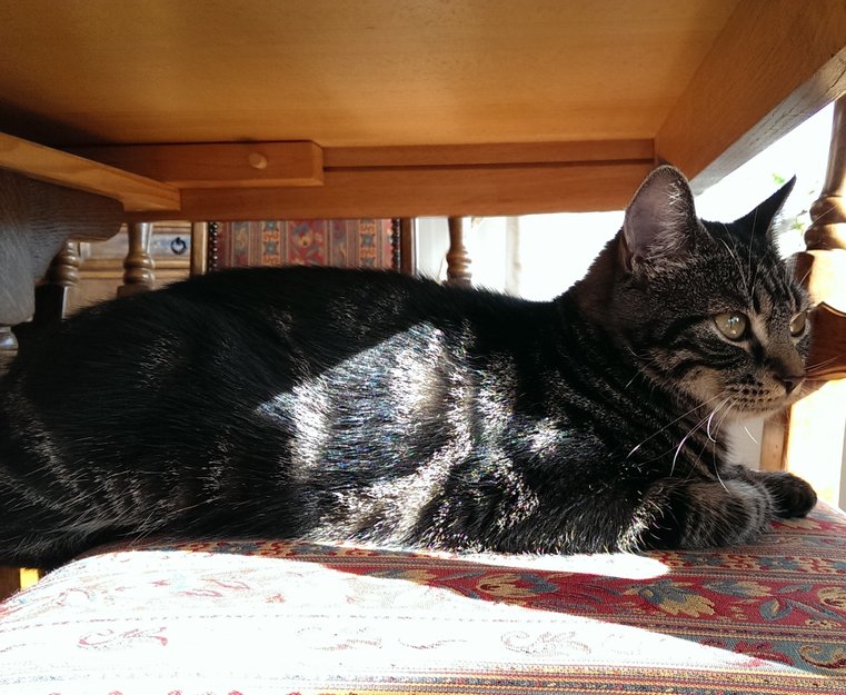 Astrid er ett år gammel. Hun er ikke redd mennesker men kan bli redd andre katter og hunder.