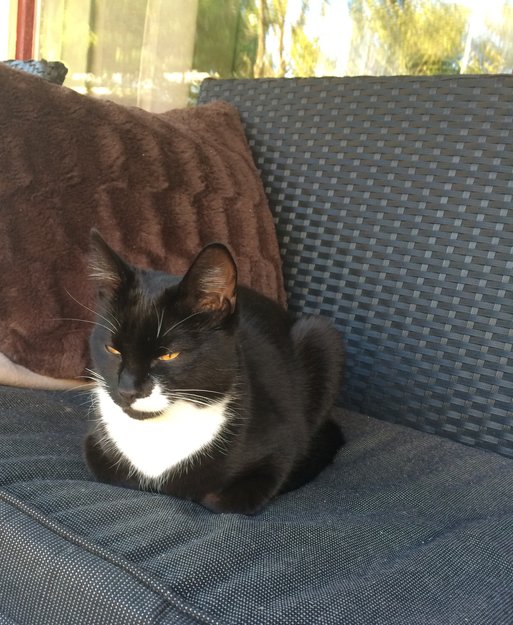 Svart med hvite poter og en hvit flekk på nesen. Veldig kosete og sutter på halsen. Ca 8 mnd. Er chippet.