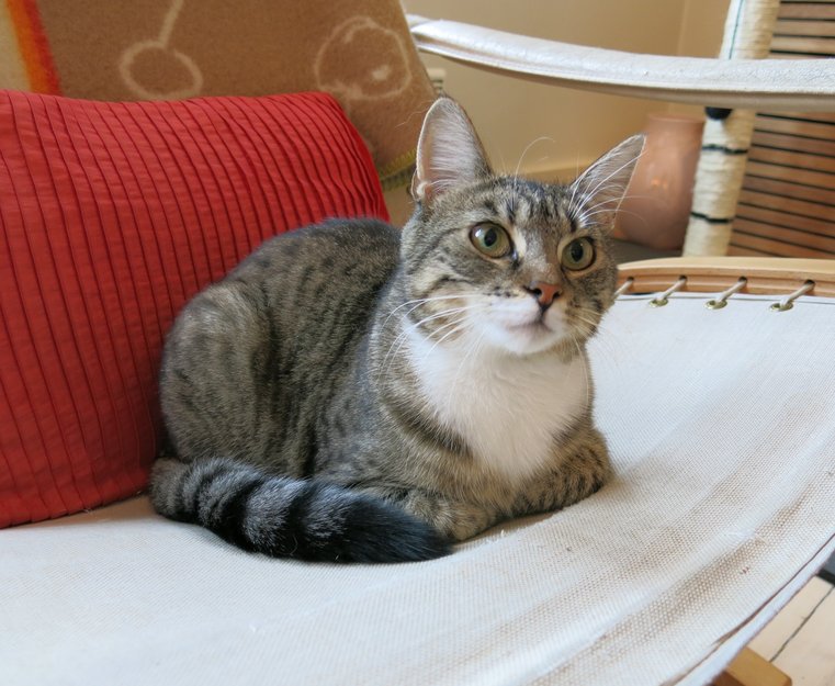 Liten jentepus. Svært blank i pelsen som er korthåret. Hun har brun/svarte striper og flekker, samt hvit hake og bryst. Hun er sterilisert og har tatovert en "M" i venstre øret.