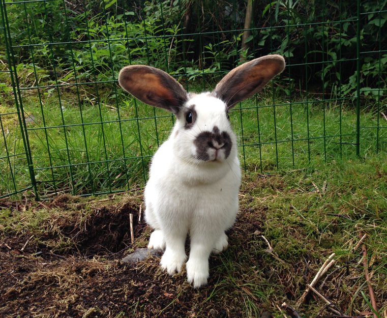 Stor kanin på ca. 3kg med oppoverører. Hvit med brune ører og nese, og flekker/strek på ryggen. Rolig og kosete.