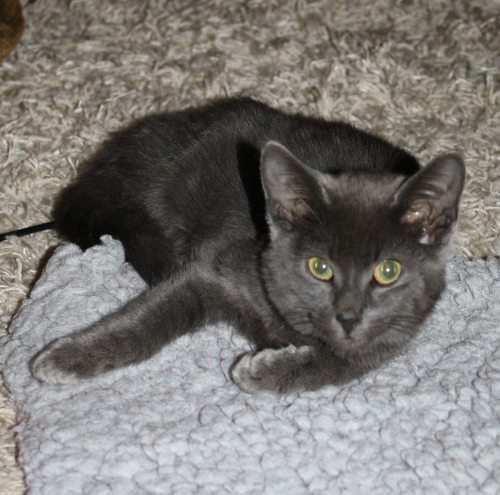 Senecio er en kattunge med korthåret grå pels.