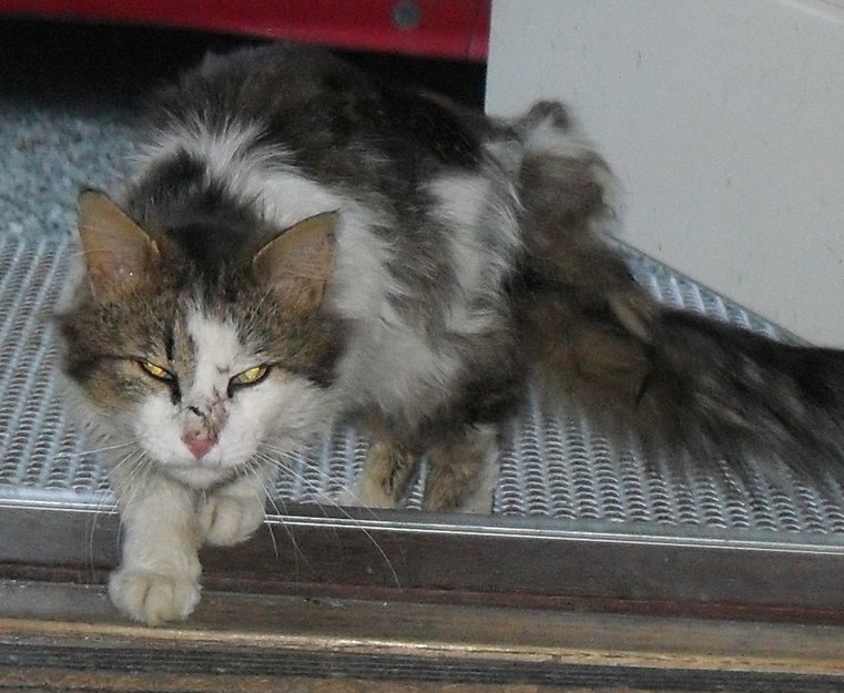 Grå, hvit og brun katt . Veldig redd og veldig tynn. Har oppholdt seg i området Bjørgmyran i Lånke siden begynnelsen av januar. Tydelige tegn på at den har levd ute i lang tid.
