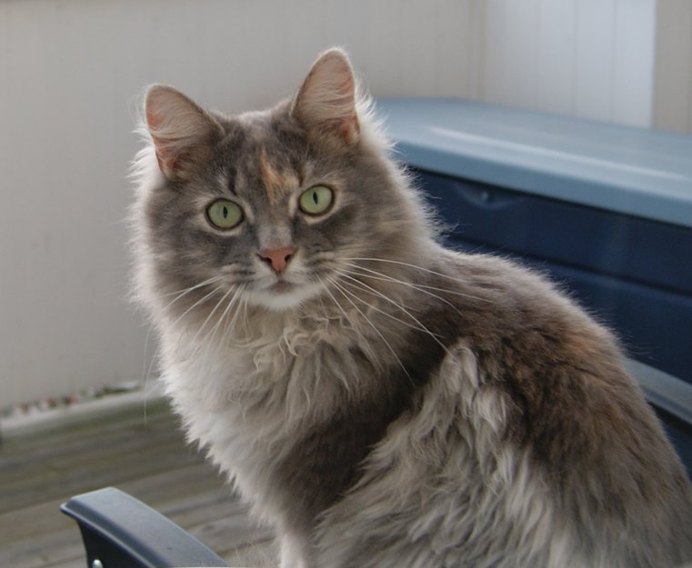 2 år gammel. Langhåret. Farge grå, litt melert. Liten oransje flekk i pannen. Sterilisert. Liten av vekst. Veldig kjælen.