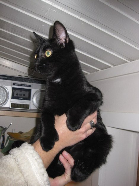 Katten er helt svart med noen få hvite hår på brystet. Katten er en skipskatt
