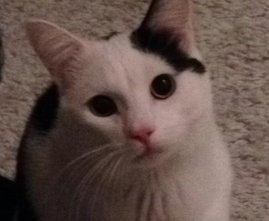 Hvit katt med svarte flekker, han har svart hale og det ene øret er svart. Han er litt kosete. Blir 2 år gammel i nov 2014