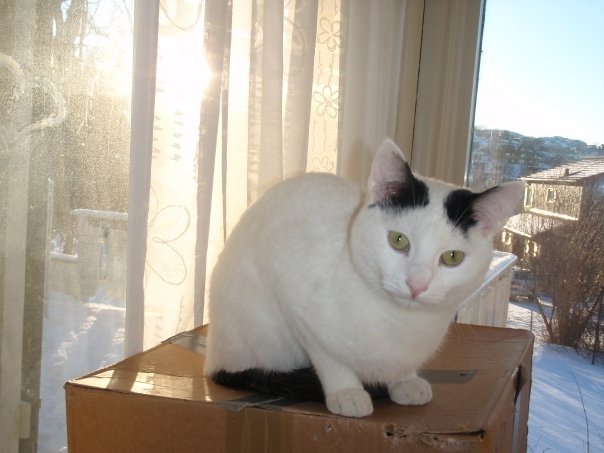 Alo lyder navnet sitt. En en hvit katt med svart hale og svart på ørene. Han kan virke sky, redd i uvante omgivelser.
