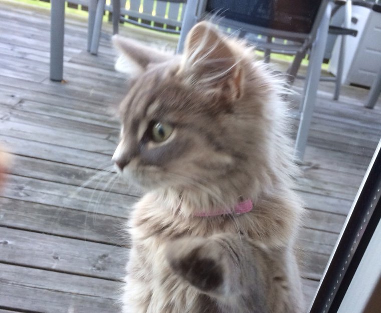 Liten katt, grå langhåret, tror det er en hunn-katt og alder ca 6 mnd. Hun oppholder seg på terrassen hos oss. Har tidligere forrige sett henne i Bergslia.
