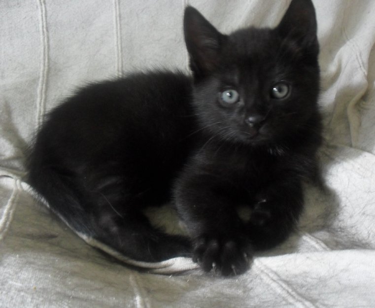 Han er veldig liten, bare to måneder gammel. Har fortsatt litt kattungepels, litt lodden med en aning grått i det svarte.