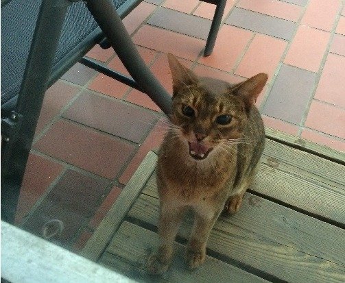 En svart og oransj/brun katt går rundt huset vårt og mjauer helt intenst. Virker veldig sulten. Utrolig kjælen og godtroende.