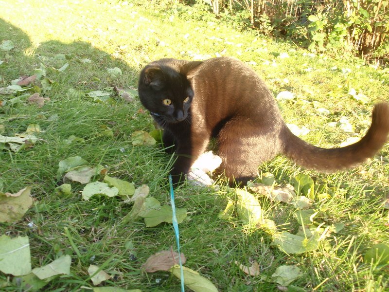 Sort og liten hankatt. Kan skimte tigerstriper i pelsen hans. Halen står som oftest rett til værs hele tiden, gjerne med en liten bøy forover.