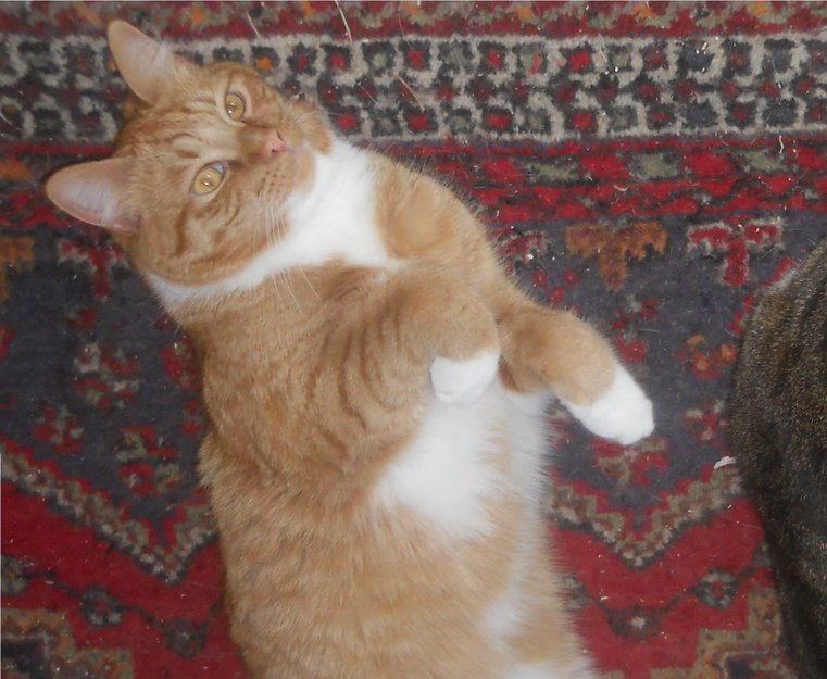 Han er hvit på underside og poter, og rød/oransje ellers (slik som bildet viser). Den hvite kragen hans går ikke helt rundt, han er rød/oransje i nakken. Gule øyne. Han piper noe når han mjauer og er svært glad i mat.