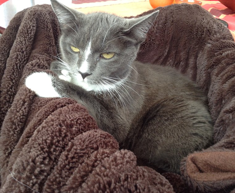 Mørk grå syv år gammel hannkatt med hvite tegninger over nese og hals. Hvite poter. Har en liten hengemage. Er chipet.