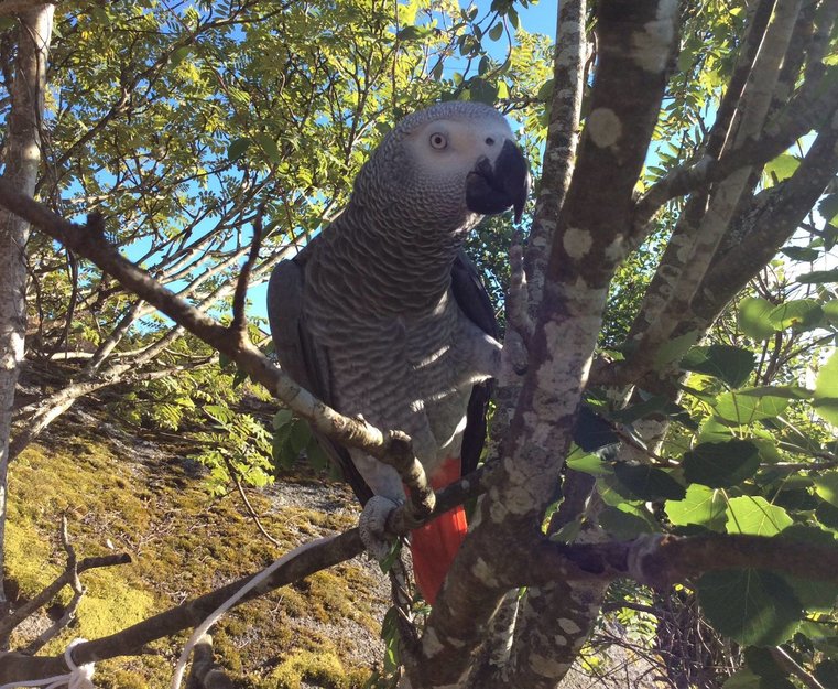 VandalF ble funnet noen hundre meter fra der han forsvant, formiddagen etter. Han ble gjenkjent på sin plystring av "Broen over Kwai" og noen spesielle telefonringelyder. Reiseradioen var så hyggelig å legge ut en savnetmelding, og da noen hyttenaboer hørte denne, la de to og to sammen og skjønte at det var VandalF som hadde landet i skogholtet. Det tok mange timer å få lokalisert hvor han satt, for han var ganske så stille da jeg kom. På ettermiddagen fikk vi øye på ham ca 15 meter oppe i et tre. Der satt han fast med snoren sin. Brannvesenet i Larvik ble kontaktet og var på pletten etter bare 20 minutter. De klatret opp og hentet ned gutten. Han skrittet straks på armen til sin redningsmann fra greina og satt rolig og fint der på hele turen ned. Han var sulte og tørst og trøtt, men ellers i fin form. Avføringen avslørte at han hadde spist noe blader :) Han som ellers vraker alt annet enn Harrison pellets og solsikkerfrø!